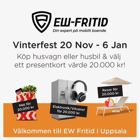 Under perioden 20 november till 6 januari har du möjlighet att göra en riktigt bra affär hos EW Fritid i Uppsala. Vid köp av husbil eller husvagn hos oss får du ett exklusivt erbjudande där du själv väljer vad som passar dig bäst: Kampanjen gäller endast för köp gjorda under den angivna perioden, så passa på att besöka oss och få hjälp att hitta just din perfekta husbil eller husvagn. Spana in våra objekt här: Husbilar eller Husvagnar Varmt välkomna, till oss på Svederusgatan 7, 754 50 Uppsala